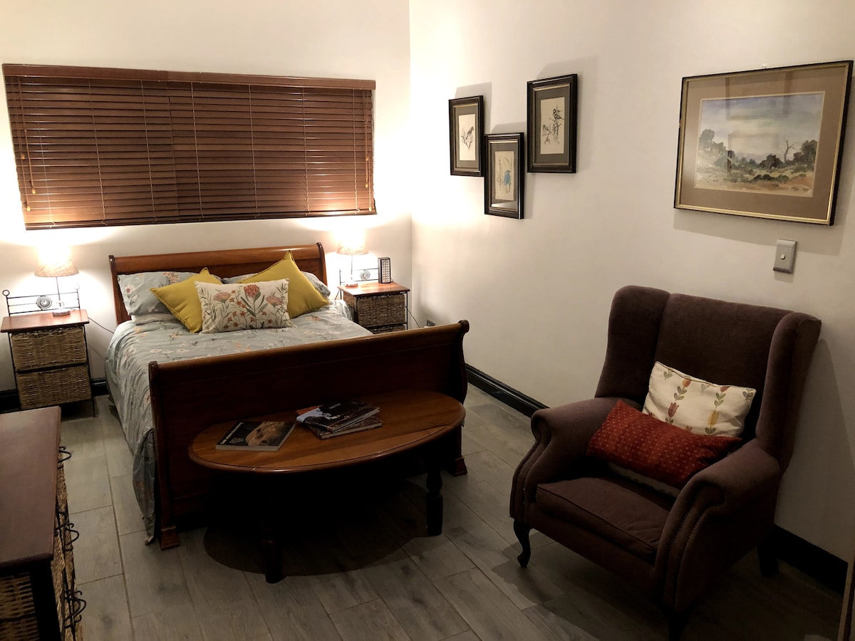 這間充滿光線的公寓設有獨立入口,與主屋分開,完全私密,非常適合享受片刻寧靜。 室內有一間舒適的臥室,配有套房浴室,還有一個寬敞的起居區,配有用餐空間和小廚房,方便您使用。 公寓配備太陽能備用電力和太陽能熱水器,讓您無需擔心電力短缺,即可享受舒適的住宿體驗。 我們與兩隻狗和一隻貓分享我們的家,這些是友善的家庭寵物,喜歡人