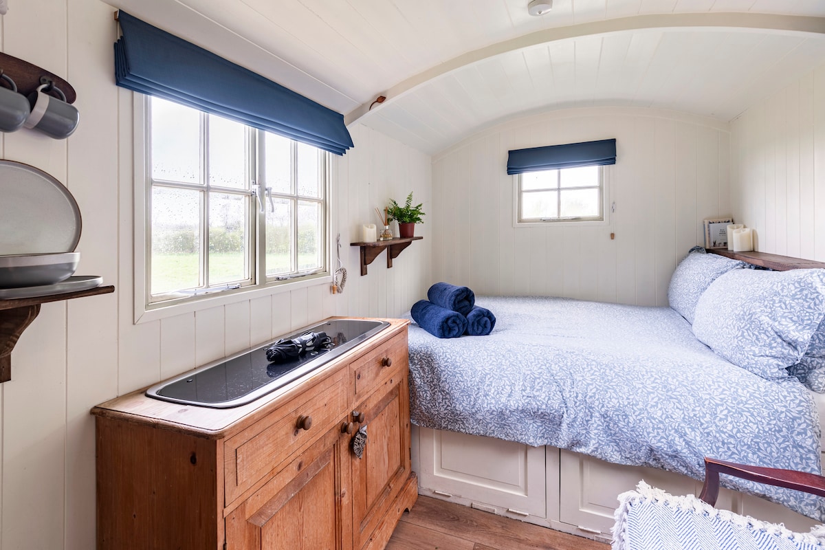 這個微型房屋拖車由我和我的兒子和孫子在2016年設計和建造,可俯瞰Wreake河和更遠的牧場。它有一張長的雙層床,下面有一張寬敞的單人床。它有一個甲板,外面有堆肥廁所,附近還有傳統的廁所和淋浴間。露營廚房距離10公尺,配備基本烹飪設備。 我們最近為燈和風扇加熱器新增了240v電源,但您仍然可以使用12v燈和木爐