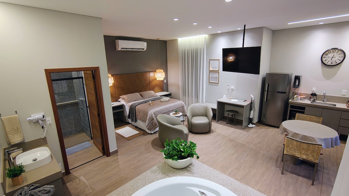 Hospedagem de charme com localização privilegiada na margem do Rio, no Parque dos Saltos de Brotas. Construção nova, bem equipada e cheia de estilo. Nesse loft, tudo foi pensado com muito carinho e preocupação com detalhes: banheira hidromassagem, enxoval de algodão egípcio, dois chuveiros, janelas e porta acústica para ouvir o som das cachoeiras se quiser. Há alguns metros de ótimos restaurantes, agências de passeios turísticos, padaria e supermercado, tornando dispensável o uso de veículo.