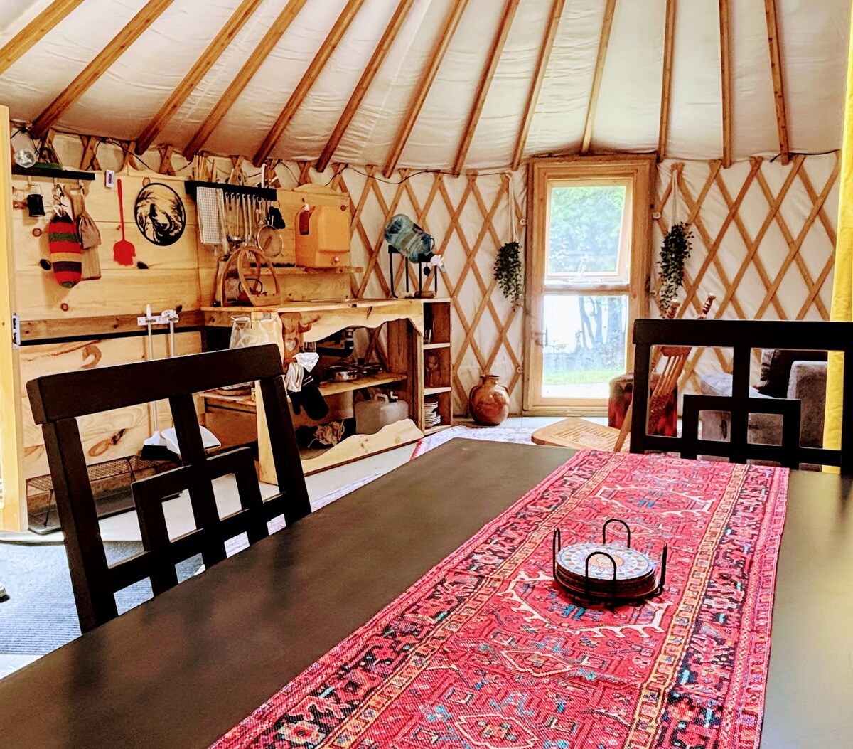 在安大略省的ReLive Retreat度假屋,享受四季營帳之旅。 Scarlet Yurt是我們較大的蒙古蒙古包,坐落在一個寧靜、適合狗狗入住的自然度假勝地,可欣賞美麗的日出景觀。 溫暖的紅色和深棕色內部、燃木爐+丙烷熱、標準雙人床加雙人折疊床、帶泉水的小廚房、帶堆肥馬桶的半浴室、私人露台、火坑區、共用燃木桑拿和3季淋浴。 坐落在一個安靜的72英畝森林物業上,周圍有野生動物和步道。