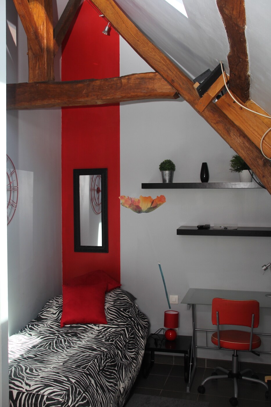 Duplex lumineux de 50m2 avec escalier au 1er dans immeuble sécurisé, au coeur de la ville, idéalement situé entre le beffroi et le palais de justice, avec une grande chambre en mezzanine pour passer un agréable séjour seul ou à deux dans la cité des géants. Parfait aussi pour passer les concours qui ont lieu à Gayant-expo.