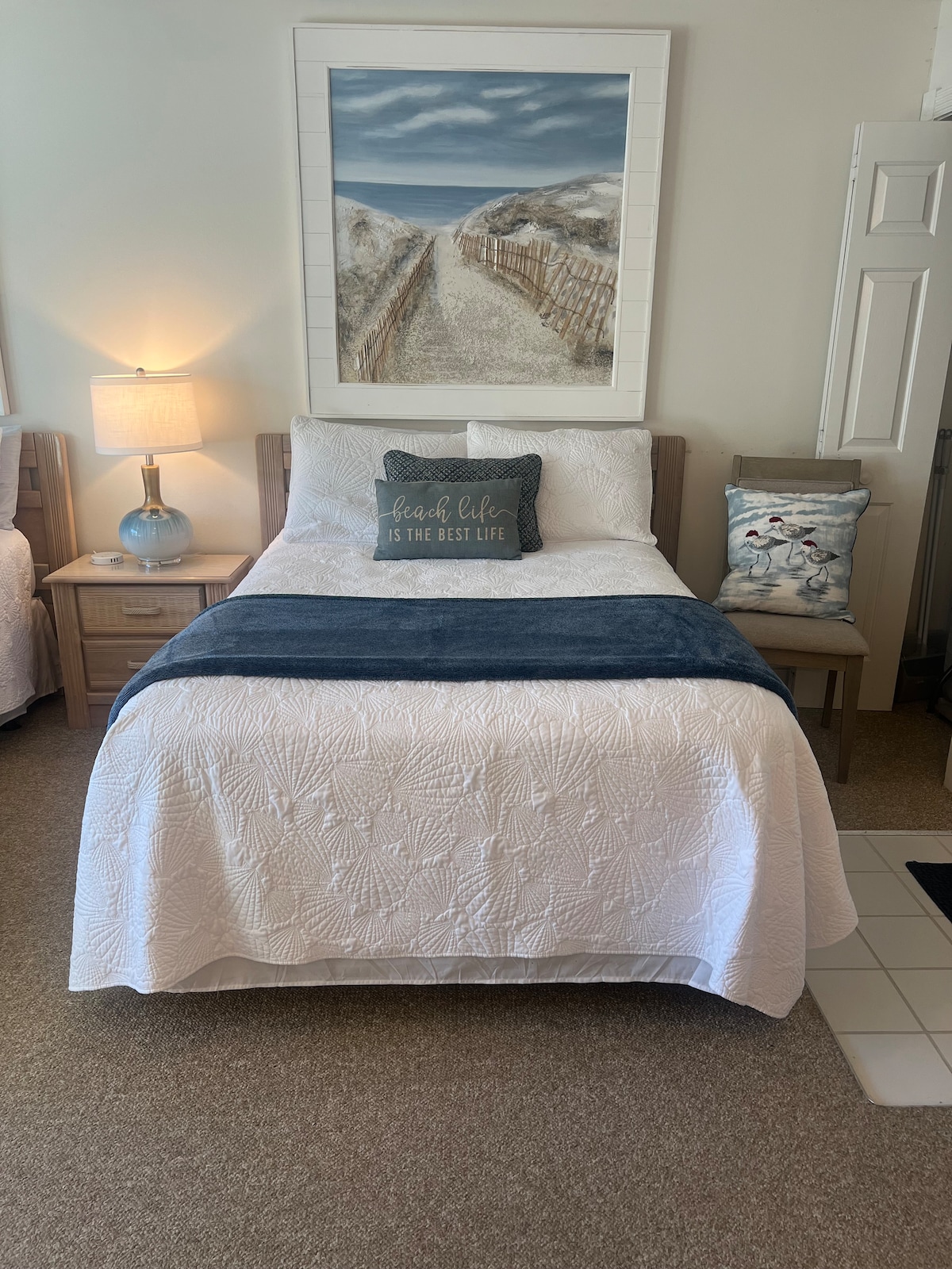 Totally Beaching - Unit #2 is one of 4 spacious condos located a block from the beach & 2 blocks from the fishing pier in the heart of historic Cherry Grove. Each unit is 900sf with 2 bedrooms, one bath, full kitchen and living room with front and rear porch access. The rear porch overlooks a natural pond teeming with wading birds and other wildlife. Guests are provided the essentials: bed linens, towels/bath clothes, cookware, and keurig coffee maker. Unit #2 is on the 2nd level right.