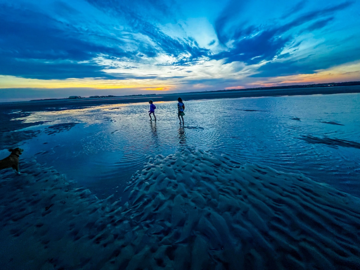 大型2400平方英尺舒適家具家居,可欣賞迷人的運河和沼澤景觀、社區碼頭可捕蟹/觀鳥,步行2-3分鐘即可抵達海灘。 無須支付海洋停車費! 包括牀單、浴室設備、基本儲藏室用品和咖啡。 設備齊全的廚房、電梯、3個有蓋室外區域和所有睡房的Roku電視。 所有床褥均設有可拆卸的枕頭套,因此可滿足所有床褥偏好。 香港音響系統、街機遊戲、車庫停車、海灘裝備、燒烤等