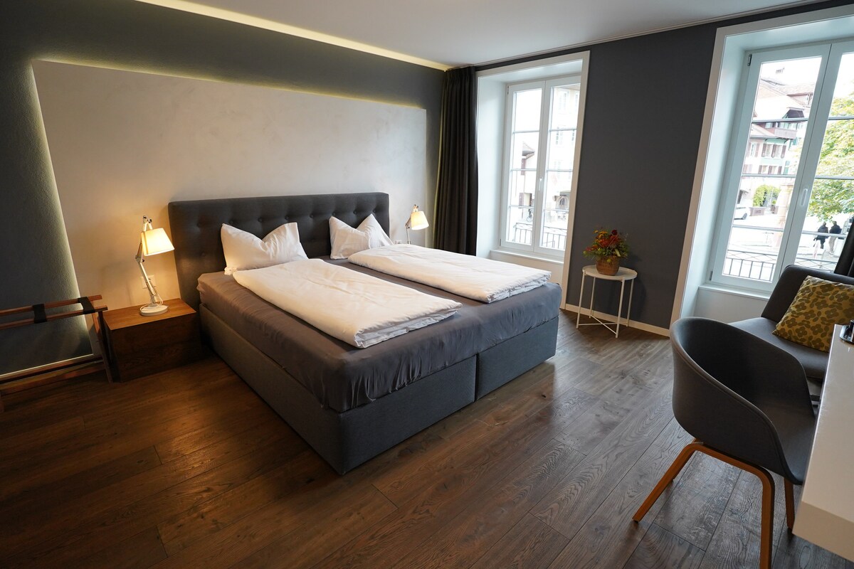 The 25 m² double rooms meet the highest requirements. They have a comfortable double bed, a work table, a cloakroom and a spacious bathroom with shower. Flat screen TV, water, Nespresso machine, hygiene products and free WiFi complement the offer. We would be happy to provide you with a tailor-made offer for your long-term stay.