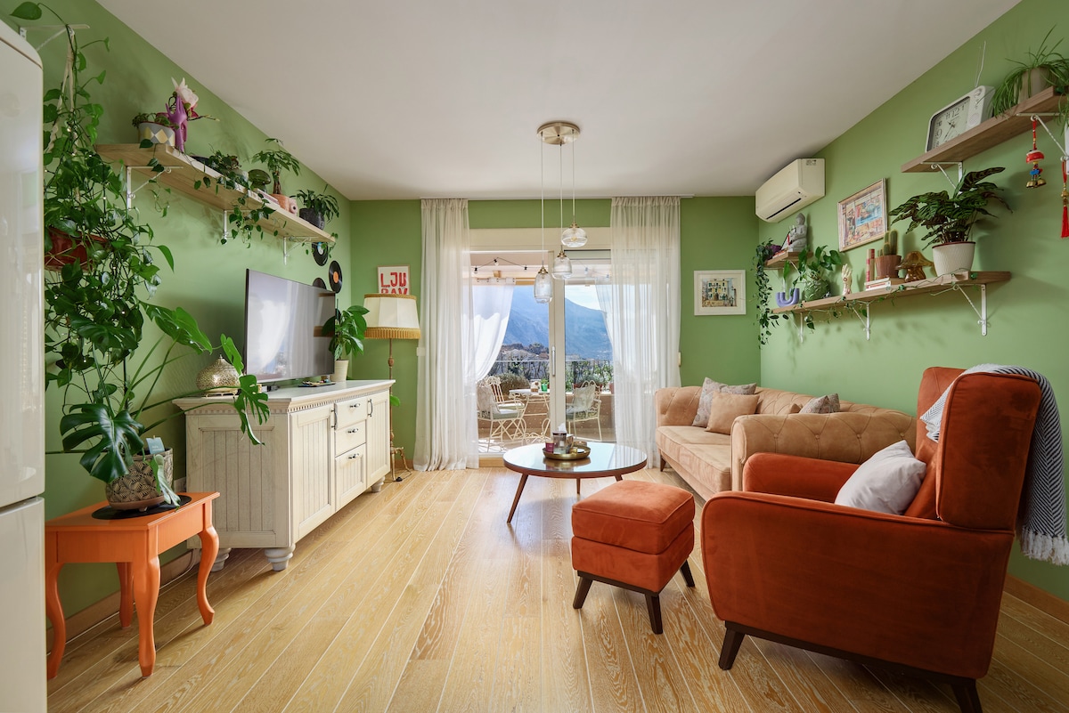 Cozy and comfy apartment with a terrace that provides a view on the Old Town walls, church and mountains. A free, spacious gym included. Very calm, safe and friendly neighborhood - only 5 minutes of a walking distance to the Old Town, bus station, gas station, beaches, supermarkets, bakeries, restaurants, fast food stores, pharmacy.. Bonus - a free private/gated parking space, a yard & an orchard, from which you can pick and eat some fresh and organic fruits.