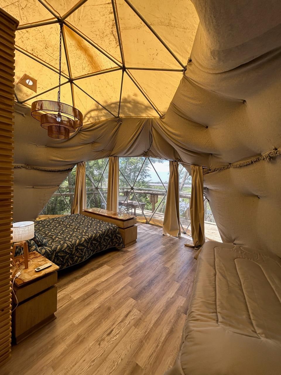 穹頂( The Dome )是一間小木屋/穹頂,由木製廚房和大窗戶構成,通往叢林,浴室天花板透明,房間直徑4米,大窗戶通往叢林和星空。 可通過人行道從小溪前往。 在小溪上方,我們有一個清澈的穹頂區域,有巴拉圭吊牀、烤架和河邊的餐桌。我們還有私人碼頭和獨木舟的可能性。