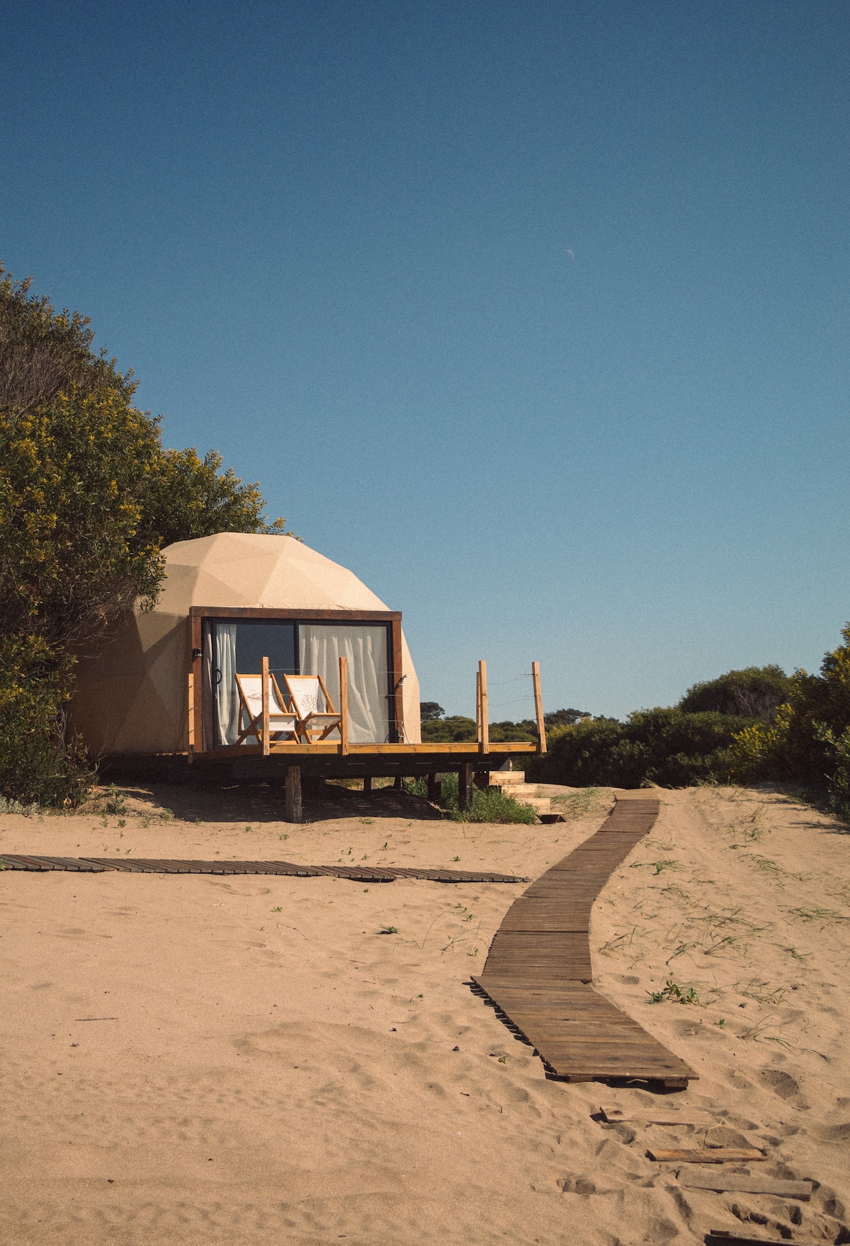 Domo Gaia - Acceso a piscinas, balneario y estacionamiento incluidos. Es un refugio premium con baño en suite y mirador de estrellas frente al mar. Calma entre médanos y vegetación nativa. Ideal para reconectar con la naturaleza y descansar en un entorno único, cálido y silencioso. Su diseño geodésico y artesanal combina confort, madera y paisaje costero. A pasos de la playa, perfecto para parejas o quienes buscan paz.