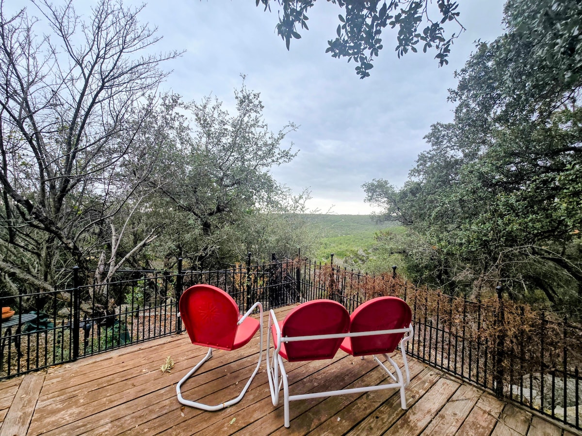 這間舒適的小木屋被稱為「The Hideway at Lake LBJ」,可欣賞小湖景,並有一個大的有頂棚門廊,配有雙人搖椅和桌椅,可供戶外用餐。 小木屋位於陰涼的小巷上,非常適合騎自行車、步行或任何想放鬆身心和「隱藏」的人。 靠近酒莊、州立公園、洞穴和釣魚點。 山地國家有101件好玩新鮮事。