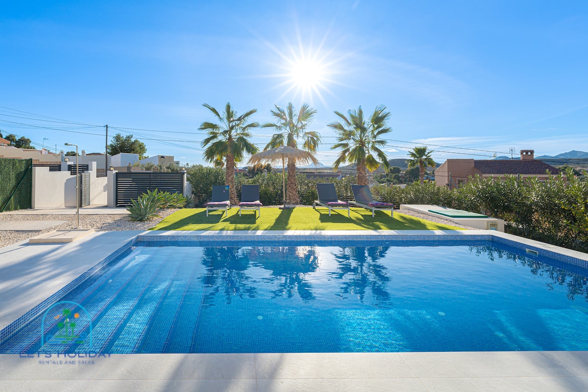 Très jolie maison neuve , calme au cœur des montagnes et à 5 mn des plages de el campello. Située dans un village paisible , vous pourrez vous reposer tranquillement sur un transat près de la piscine privative , siroter un cocktail sur la terrasse, effectuer de la randonnée… La villa se situe à Busot , entre alicante et benidorm . L’aéroport se trouve à 25 mn . Ce petit paradis. Dispose d’une piscine privative de 4x5 m , mais aussi d’un accès à la piscine de la copropriété avec bains remous ….