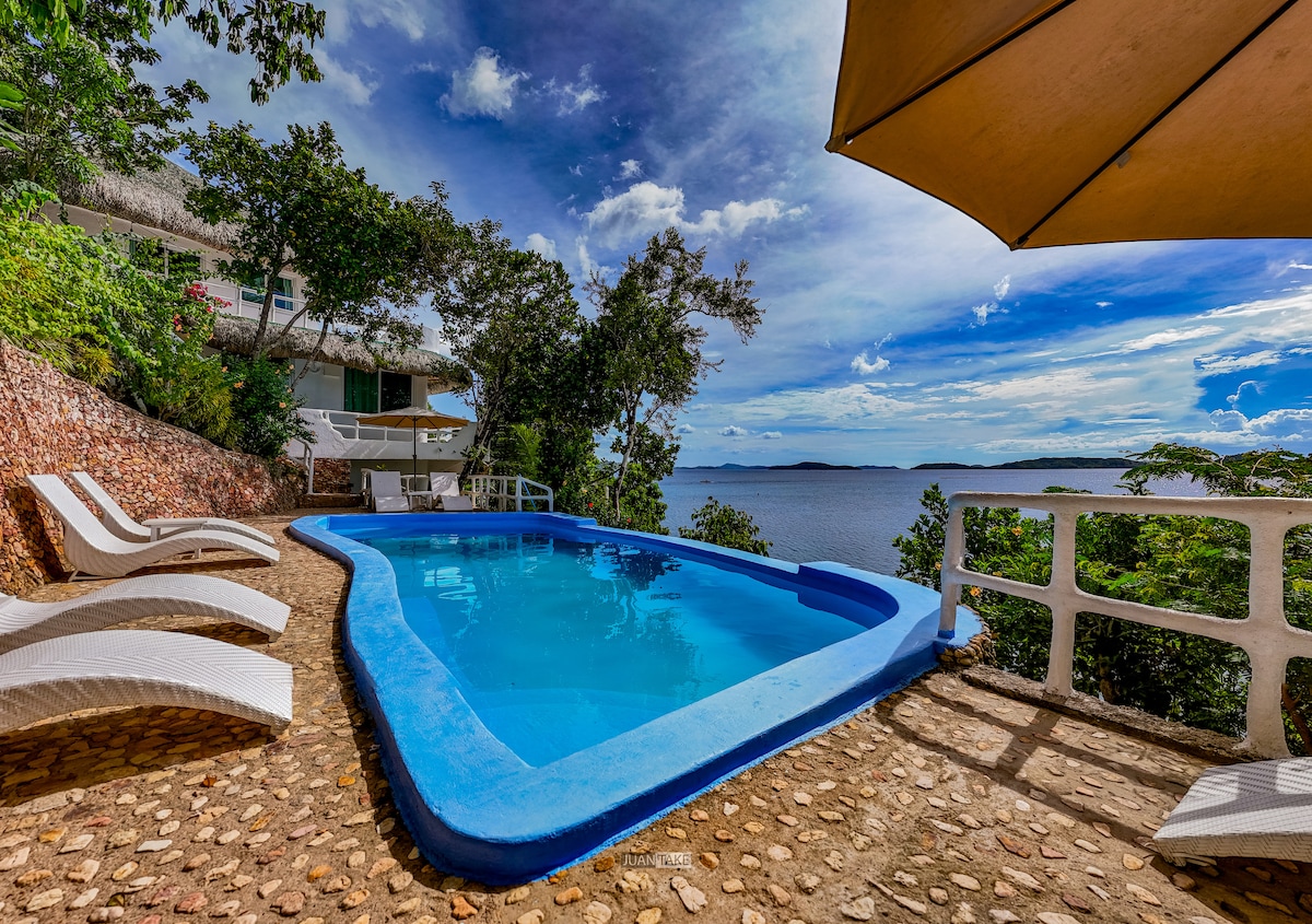 奢華天堂,為追求與自然和諧共處的您而設-坐擁壯麗的海灣與海洋全景。私人無邊際泳池和花園(非共用)。提供旅遊、身心按摩和水肺潛水等服務。業主兼廚師 Mel 提供新鮮食材和現場熟食,包括起司、葡萄酒等。超時尚的一臥兩衛套房擁有寬敞的環繞式露台、戶外休息區、廚房和餐廳,現代化的臥室配備特大床和獨立衛浴,以及帶雨淋式花灑和繭式浴缸的完整浴室,並設有設備齊全的美食廚房。寬敞的開放式起居空間設有三個開放式休息區。提供 Starlink 無線網路。