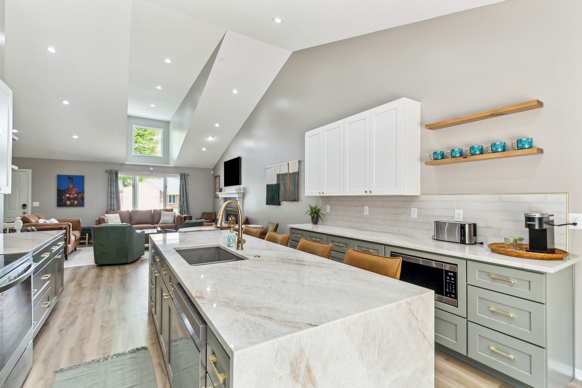 這間新裝修的房源位於堪薩斯州安多弗市中心,房客將體驗一流的住宿🌾。 位於上城,步行即可抵達餐廳、酒吧、快餐店,非常靠近主要十字路口。此房源設有4間臥室和3間浴室; 3間客廳區域,有足夠的空間可供13位以上的房客入住,有10張床、5張沙發、3臺電視、壁爐、火坑、燒烤架、大院子,在靠近一切的安靜社區享受美好的單車騎行