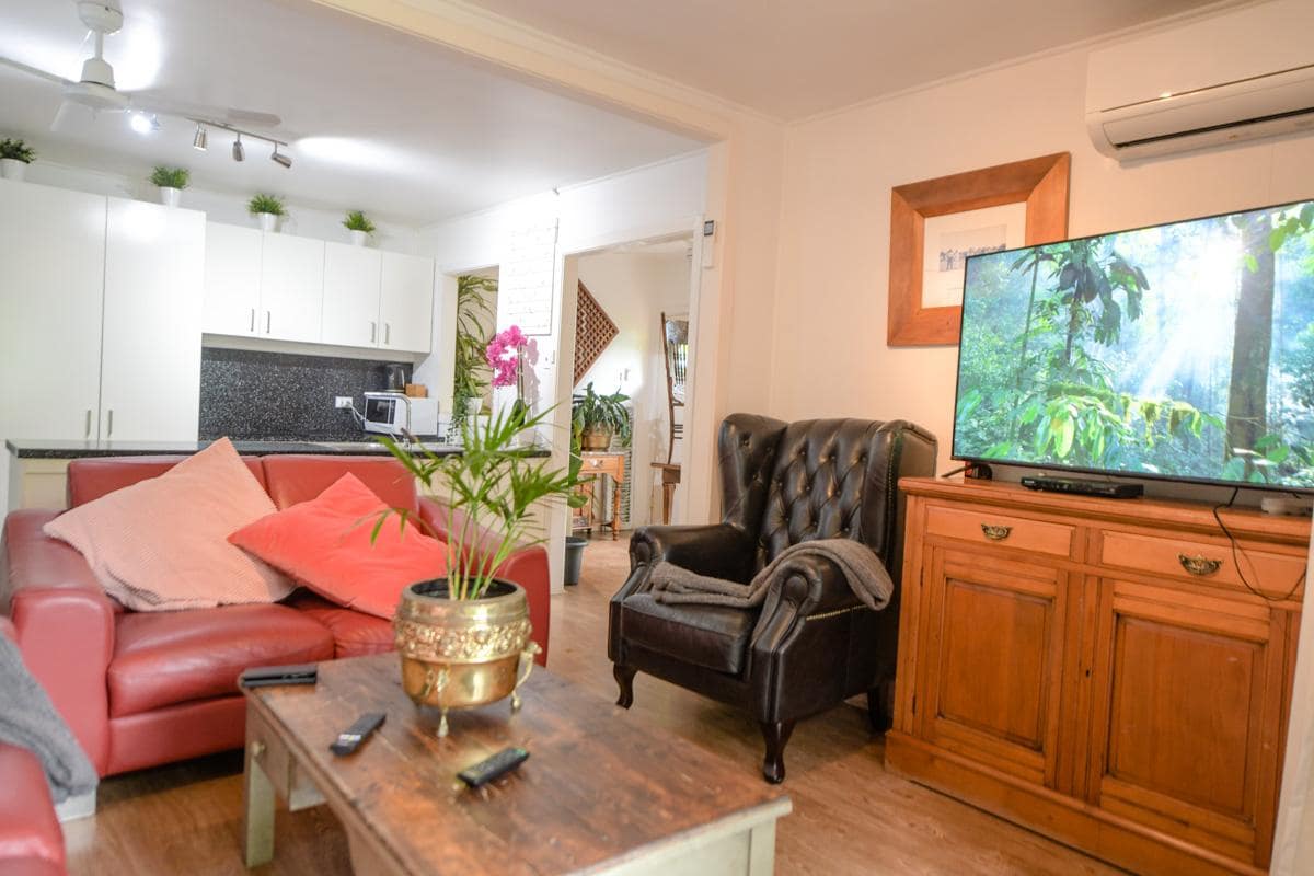Eco Friendly Self contained cabin set amongst 25 acres of rainforest ready to explore. Fully equipped kitchen. Smart TV with Netflix and Stan. Wifi, Air conditioning, Ambient Wood Fire and fire pit with wood provided during cooler months (May-Sept). Luxury bedlinen, Super comfy Queen bed. Luxury leather single recliner. Recently renovated bathroom. Easy 7km drive into Mullumbimby. Explore our new mega treetop hammock. Fireflies Aug/sep, glow worms during wet season.
