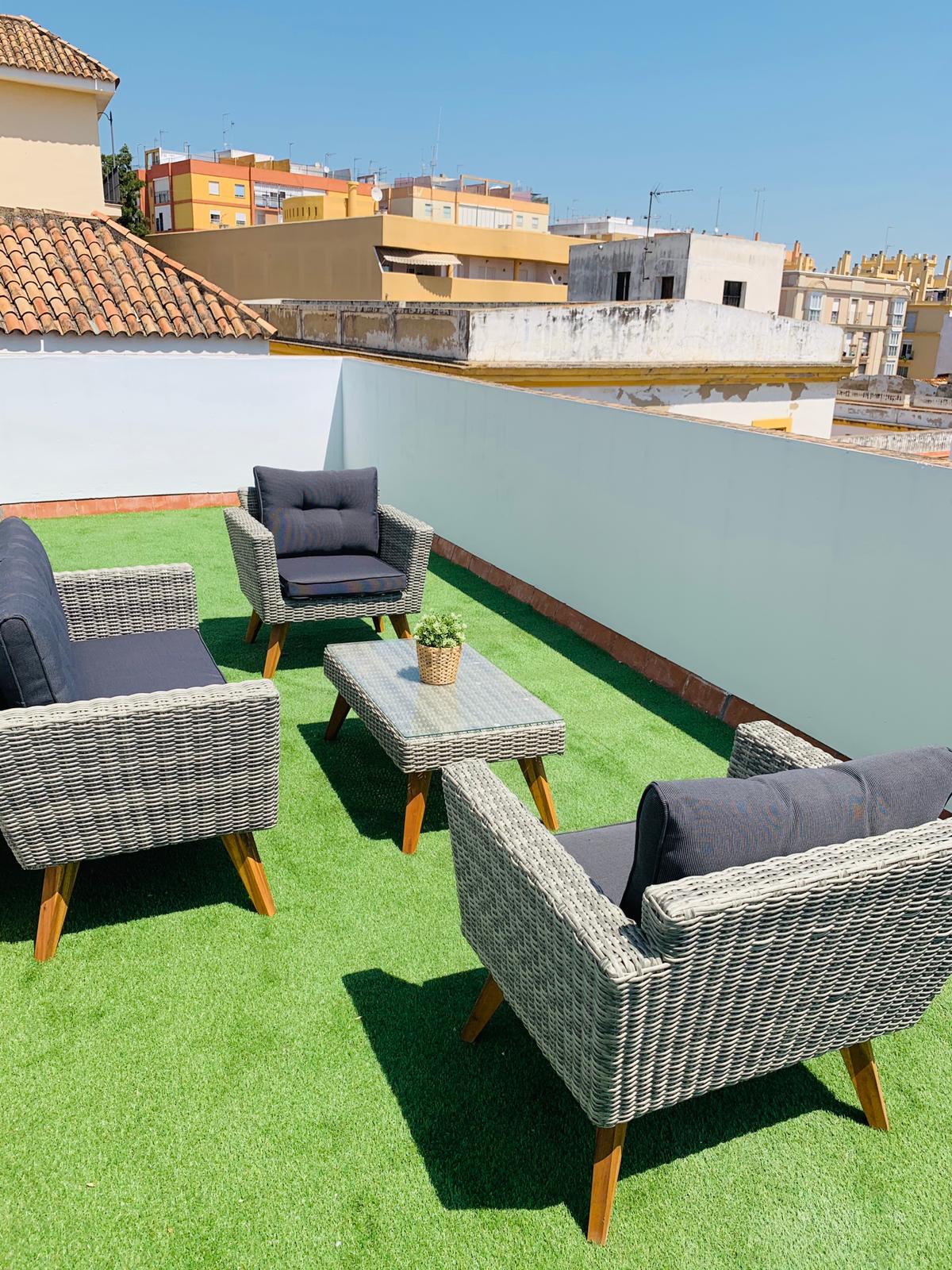 This wonderful attic has a private terrace and a lot of charm. It is located in a light-filled palace house, one minute from the Plaza del Cabildo. The building where it is located is newly renovated, mixing Andalusian style with modernity and elegance. The apartment is designed for families or friends to enjoy the city, nobody will leave you indifferent.