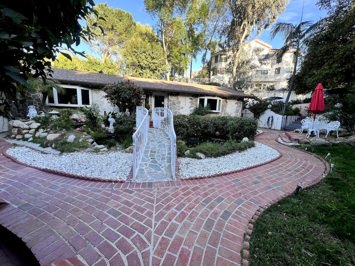 在一條私人街道上,在巨石、小徑和自然保護區的寶石,有充足的停車位! 客用住房提供舒適的設備,配有寬敞的起居區域;所有房間均設有高拱頂天花板;配有65英寸智慧4K電視,配有免費串流應用程式( 4K Netflix等)和當地新聞。 位於一個農村社區,但距離最近的餐廳、雜貨店、劇院、購物中心5-10分鐘車程,開車30分鐘即可抵達海灘和主要的洛杉磯杉谷旅遊景點。