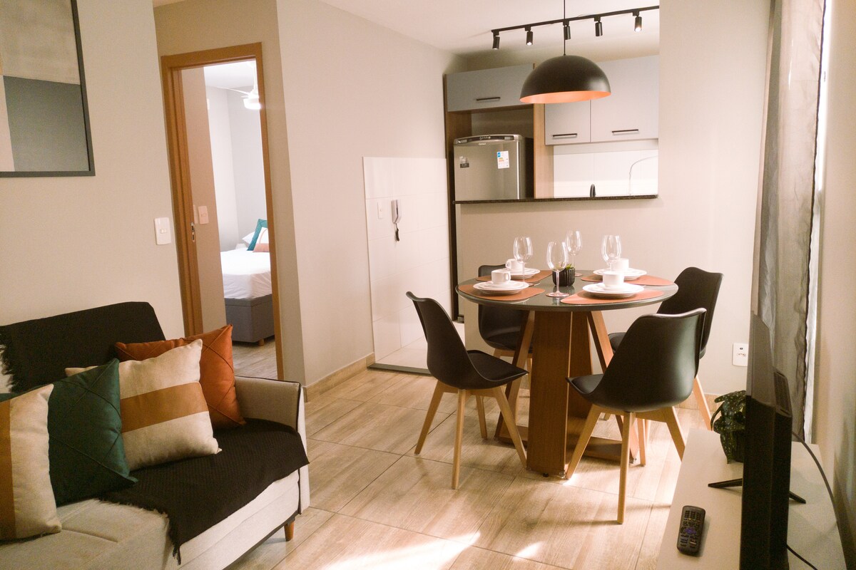 現代、溫馨和設備精良的Apê in Cambé ,方便前往UEL、Expo Londrina、Shopping Catuaí、Gleba Palhano和Londrina的中心地區。 2間臥室( 1張雙人床+ 2張單人床) ,最多可入住4人。 它配有洗衣機和烘乾機、可控制的天花板風扇、快速Wi-Fi、配有應用程式的智能電視(使用您的登入)和配有電力和餐具的全功能廚房。 非常適合短期或長期住宿。 旅居主人為你精心準備了一切,讓你即使遠離家鄉,亦能感受到家的溫馨。💛