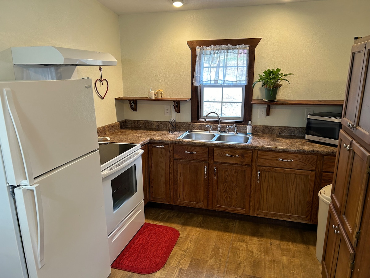 1 bedroom guesthouse in the rolling hills of the Ozarks on 40 acres of pasture and woods - stay in a quiet place with all the comforts of home. Roam the property, relax on the porch, commune with nature or roast hot dogs at the fire pit. Just off Route 66, less than an hour from Branson, Lake of the Ozarks, Springfield and Fort Leonard Wood, this unique location offers both country quiet and nearby access to shopping and adventure.