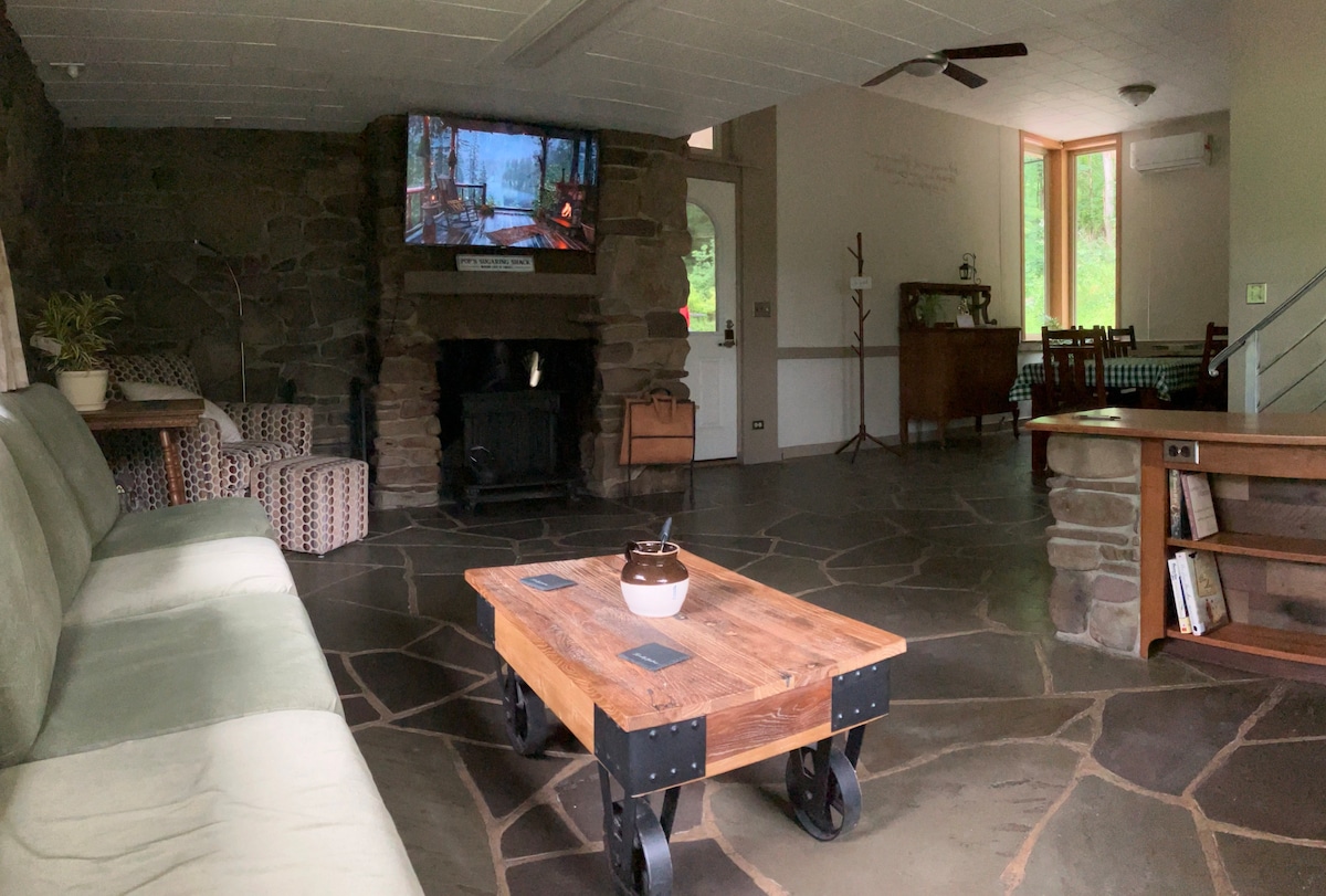No cleaning fee or checkout chore list at this organic modern home designed by renowned architect Raymond Viner Hall. Situated in the Allegheny Mountains, amid gardens and attached greenhouse and a hundred yards from the Sinnemahoning Creek, it is the perfect getaway for nature lovers, but still only a mile from town. Renovations combine modern conveniences with classic style. Spacious home with more than enough room for everyone to be comfortable, yet provides the chance reconnect and relax.