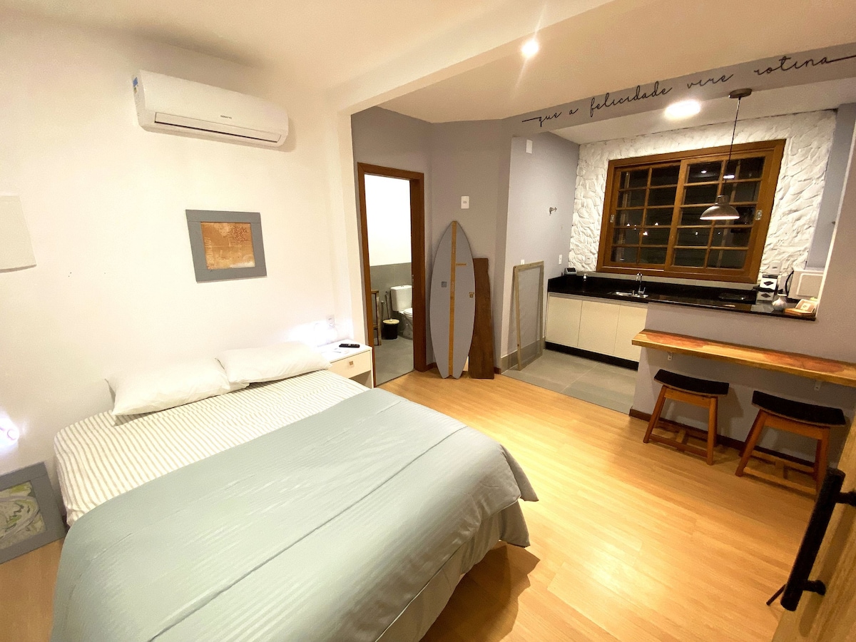 30 平方公尺的底層公寓,配有 1 間臥室、客廳/廚房和獨立衛浴。距離Joaquina海灘1400公尺,位於安靜的死胡同,您可以享受寧靜的夜晚,在鳥的歌聲中醒來。該地區也靠近 Lagoa da Conceição ( 1公里)和Praia Mole ( 2.1公里) ,非常適合海灘日、徒步旅行、運動和夜間郊遊。設備包括60mb Wi-Fi、設備齊全的廚房、空調和舒適的床。