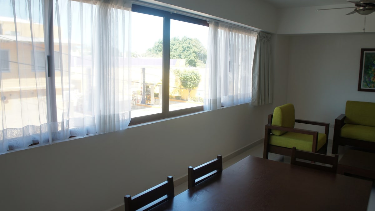 Ideal para 1 o 2 personas. Departamento de una recámara con cama matrimonial, clóset, ventilador de techo, aire acondicionado, TV 32". Oficina con escritorio. Sala, comedor. Cocina equipada con refrigerador, parrilla eléctrica, cafetera, cubiertos, vasos y platos. Acceso a nuestras áreas comunes: alberca, gimnasio, terraza y estacionamiento privado.