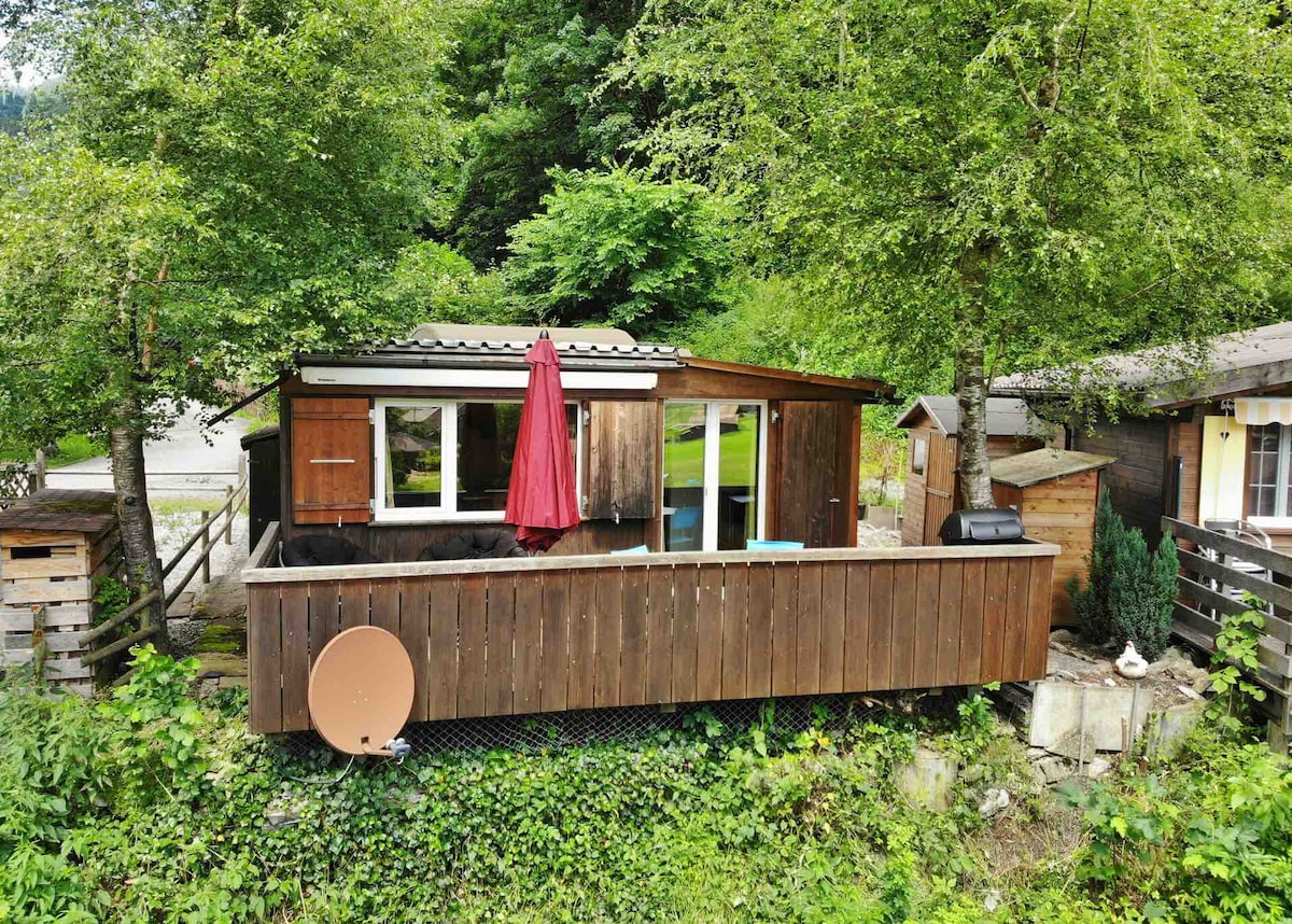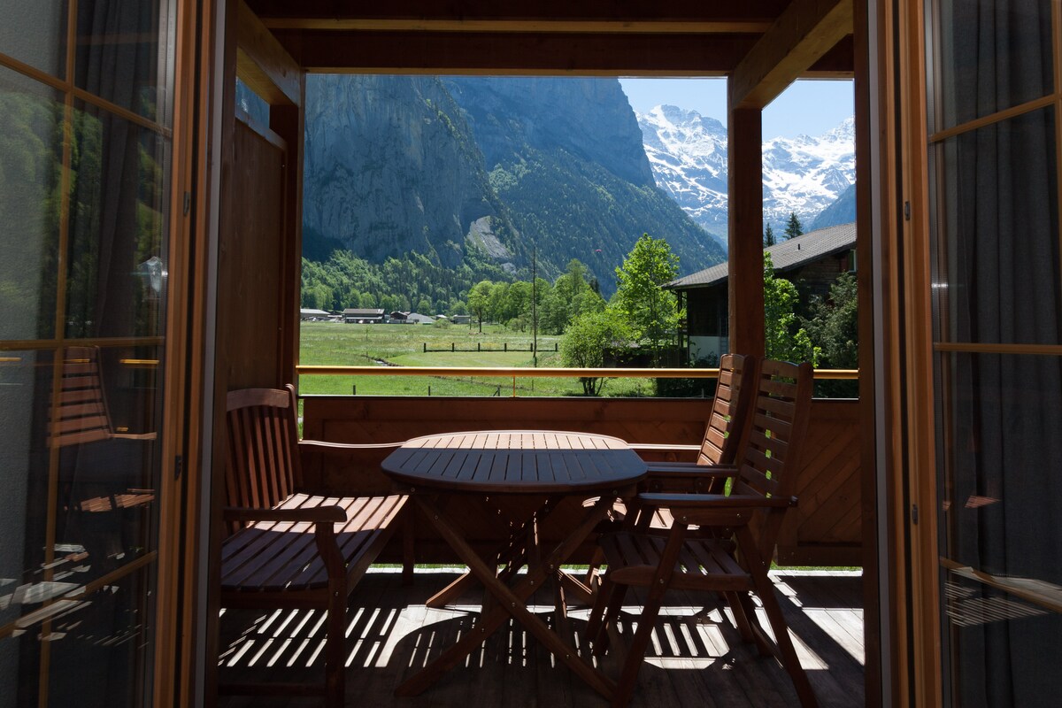 小木屋「Wasserfallhüsli」位於勞特布魯南的中心,可能是勞特布魯南最壯觀的景觀。 從陽臺上,您可以俯瞰巨大而世界著名的斯塔布巴赫瀑布。 除了Staubbach瀑布外,還可以看到另外五條瀑布。 斯塔布巴赫瀑布前面就有教堂。