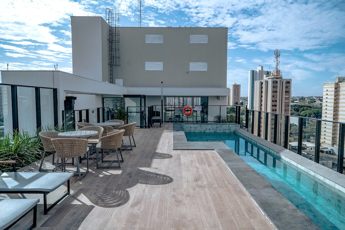 我們位於24樓的超級奢華房源,提供奢華舒適的住宿體驗。 毗鄰Afonso Pena大道和Campo Grande購物中心,這間單間公寓的景觀是獨立的表演。 單間公寓配有空調、標準雙人牀、智慧電視、帶島嶼的廚房、沙發和漂亮的衣櫃 在Vertigo Premium Studios ,您可以使用美容院、桑拿房、一樓有無邊境和餐廳的加熱泳池。 歡迎