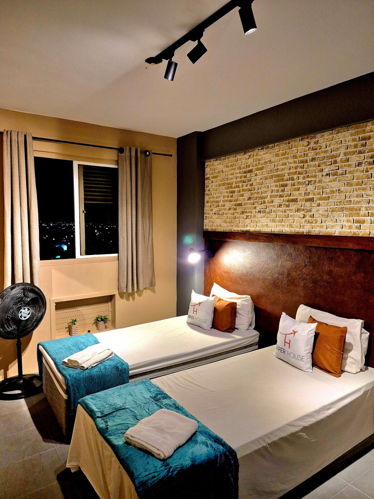 ✨ Sinta-se em casa no coração de Campos Imagine acordar em um apartamento claro, arejado e cheio de charme, com uma decoração em estilo rústico moderno que transmite aconchego e tranquilidade desde o primeiro momento. O espaço foi pensado para proporcionar conforto acomodando até 3 hóspedes. Você pode optar por 1 cama de casal e 1 de solteiro, ou transformar em 3 camas de solteiro, adaptando-se perfeitamente à sua necessidade — seja para uma viagem em família, com amigos ou a trabalho.