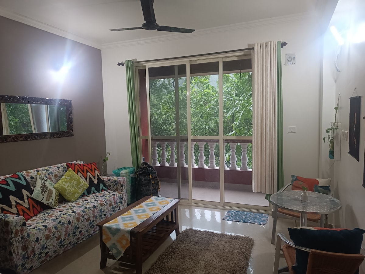 在這個寧靜的住處與家人一起放鬆身心。我必須提供一間配備齊全的服務式公寓。除了健身房、游泳池、遊戲區等社區設施外,公寓還配有空調、自動洗衣機、冰箱、電磁爐、智慧電視、熱水器等現代設備。房子從陽臺和臥室坐落處可欣賞到令人驚嘆的森林景觀。公寓距離世界著名的帕洛勒姆海灘(Palolem Beach)3公里。來愛上大自然吧...