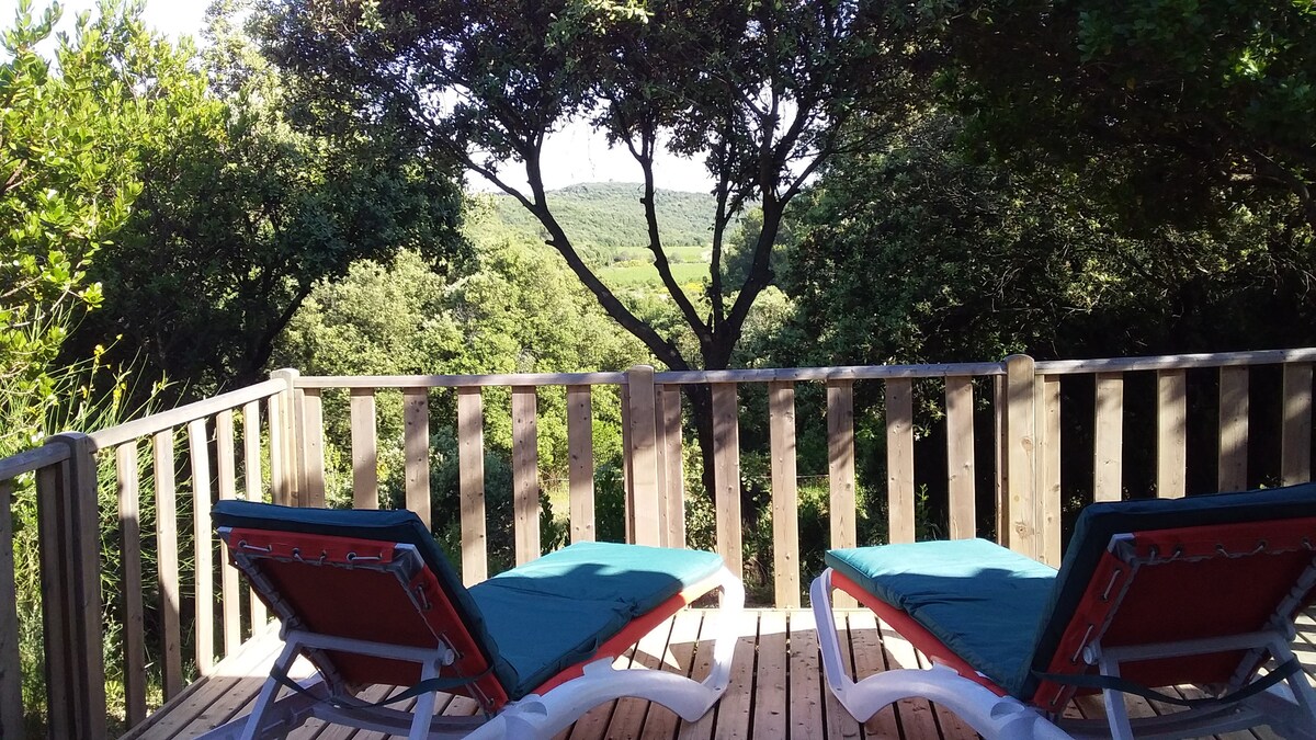 漂亮的度假木屋,空調,小型私人泳池2 × 2公尺。 最多2位成人和2位兒童,在我們的場地上獨立。 在鄉村環境中度假,欣賞Pézenas、Agde和Marseillan la mer附近的葡萄藤景觀,距離Sete 26公裏 附近的超市。 1小時內有大海、湖泊和所有其他活動的綠色住宿。