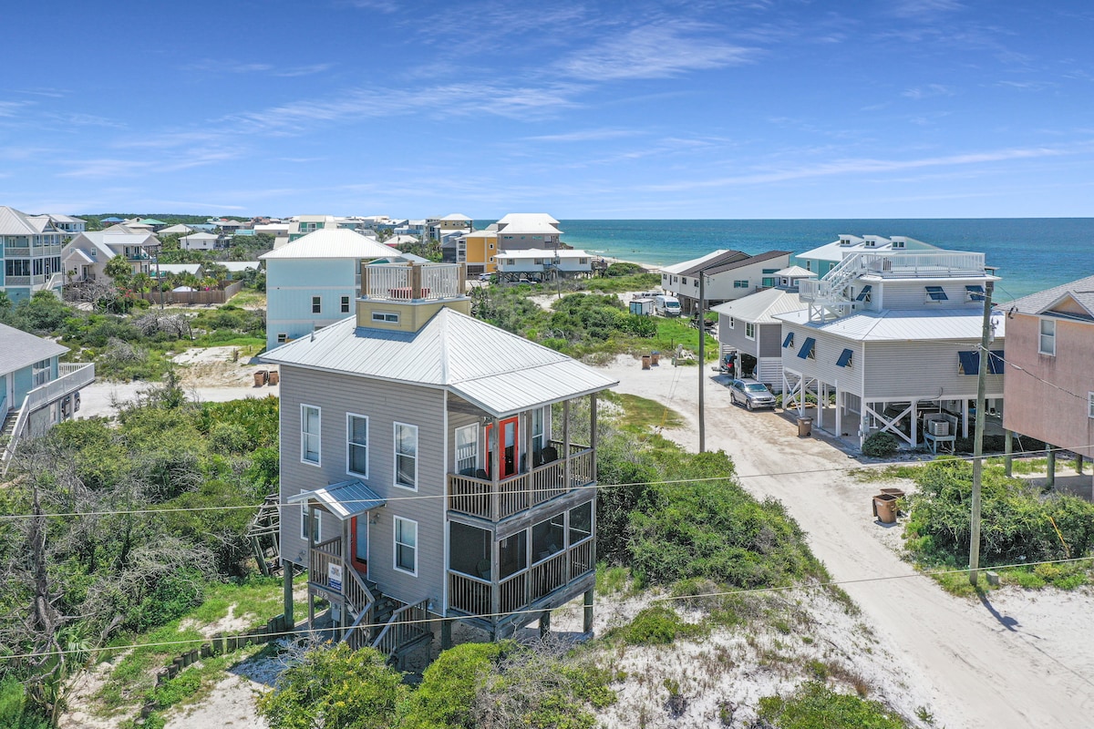位於令人垂涎的聖布拉斯角( North Cape San Blas ) ,可欣賞迷人的海灣景觀! 您無法更接近水域! 從每扇窗戶都可以看到壯麗的海灣景觀,這間4牀/3浴室海濱房源是放鬆身心,與您喜愛的人共度美好時光的理想場所。 走下樓梯,您就到了沙灘上,距離大海僅幾步之遙! 請勿將沙灘裝備拖曳穿過街道、下木板路或通過社區通道。