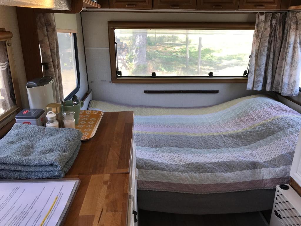 露營車最多可入住2人,配有小廚房。 隔壁有共用馬桶和浴室。 大篷車位於花園的底部向西 抵達時,請開車前往Ringebygård的庭院。 這隻狗屬於農場。 距離Vestermarie Brugs 2公裏,距離直達Rønne的公共巴士600公尺。 無法接待房客的寵物。 乾淨的牀單。請勿在推車內吸煙。 這是一個火坑。