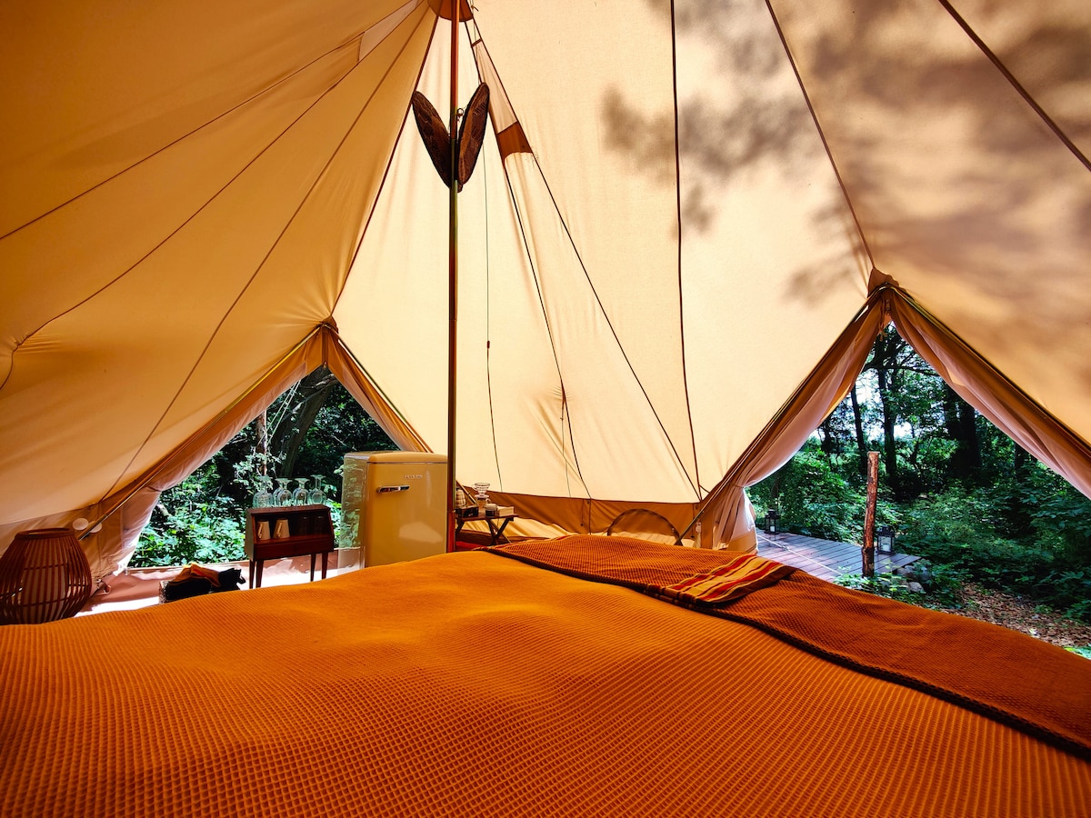 Lad dit indre ur-menneske og dit moderne jeg komme i kontakt med hinanden i en glamourøs og afslappende glampingoplevelse. Vi sørger for de mest nødvendige ting til camping, som madrasser, puder, dyner, båludstyr og indendørs teltovn som også kan bruges til madlavning ved dårligt vejr. Vi tilbyder også fri afbenyttelse af privat spa som står lige uden for ens telt.