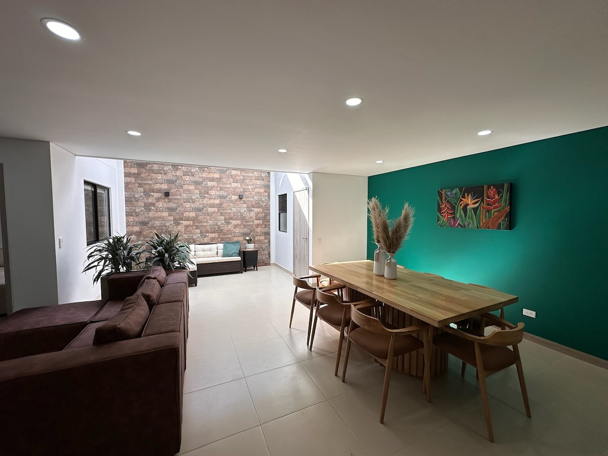 Lujosa y amplia casa para 8 personas, con 4 cómodas habitaciones, 4 baños , una sala elegante y patio con jacuzzi. Ubicada en San Antonio de Pereira, un exclusivo sector a las afueras de la ciudad y cerca del aeropuerto. A pocos pasos de la zona rosa, rodeada de clubs, restaurantes y bares para disfrutar lo mejor del ambiente local. Ideal para compartir con familia o amigos. Tener presente que debido a la cercanía a los restaurantes y clubs puede haber ruido durante tu estadía