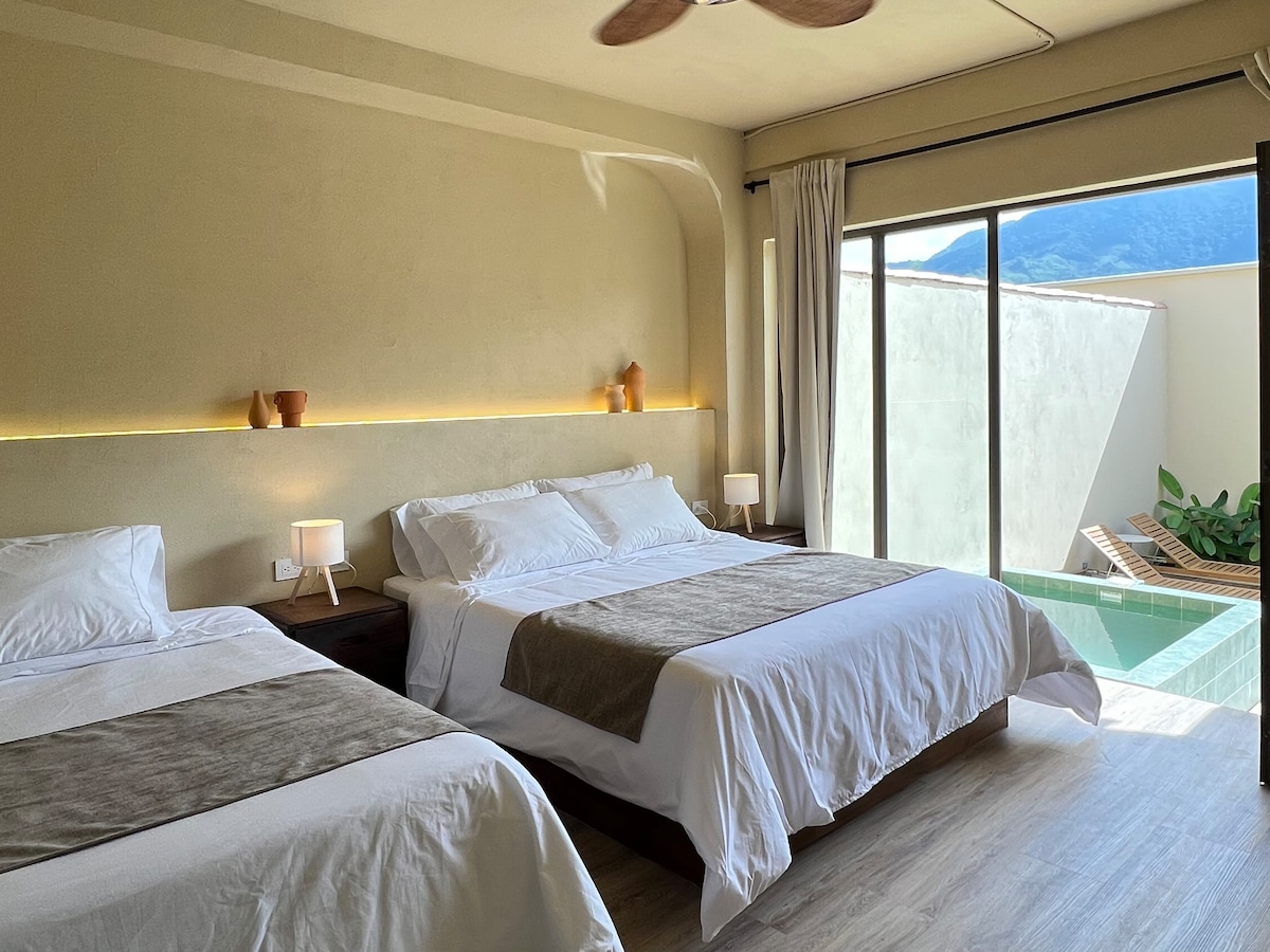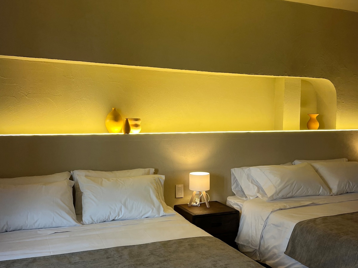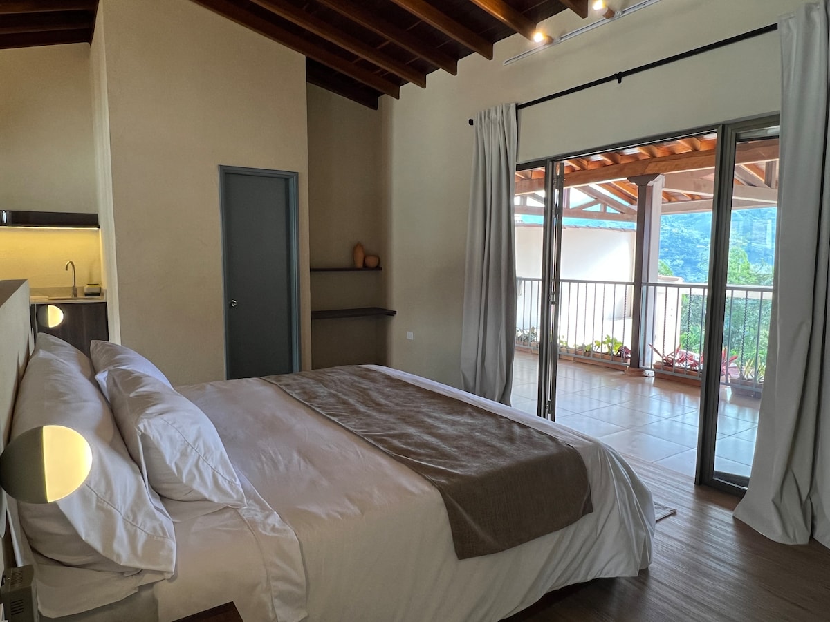 Habitación en el Carmen de Viboral, un ambiente totalmente acogedor con todos los servicios ideales para una estadía llena de naturaleza, cultura, y confort. -3 Adultos -Habitación de 30 m² -2 camas dobles cada una con medida de 1.40 x 2 M -Baño privado con amenities -Balcón vista a exteriores -Tv -Armario -Vajilla cerámica -Escritorio con sillas -Caja fuerte -Lencería 300 hilos -Wi-Fi 100MB privado por habitación