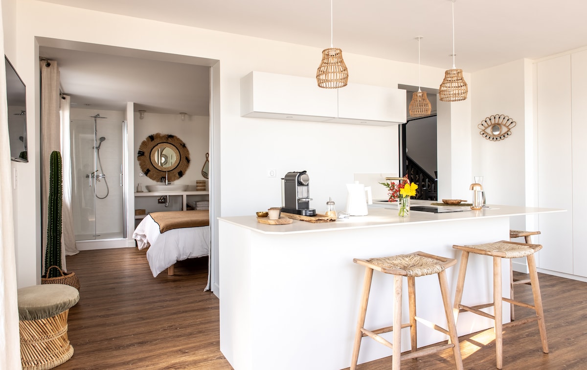 這套 47 平方米的公寓位於卡納克和滨海特里尼泰之間,設有全景日光露天平台,可俯瞰孟杜海灘,定能為你帶來難忘的住宿體驗。 這個起居空間的一切都很淺色。 這是一幅不斷變化的畫作。 寬敞的公共休息室非常適合放鬆身心。 這個旅居配有設備齊全的精緻廚房,是您盡情享受住宿體驗的理想之選。 寬敞的餐桌吧檯讓你可以在溫馨的氛圍中準備餐點。