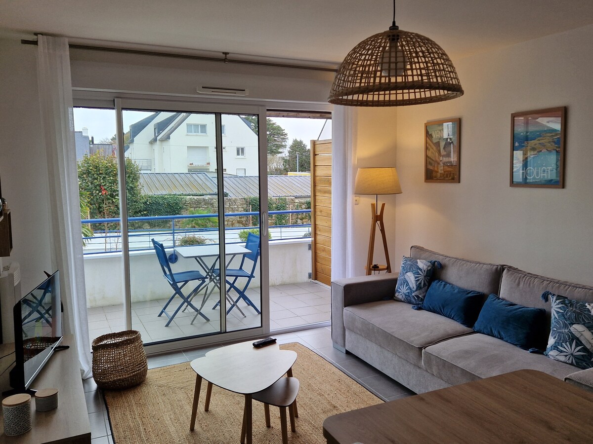 位於基伯龍 (Quiberon) 的中心,步行即可抵達。50 平方公尺的舒適安靜公寓,面向南方的大海灘,有超棒的露台。大客廳、廚房、特大床臥室、淋浴間、獨立廁所。廚房配備洗碗機、烤箱、微波爐、洗衣機、Nespresso 咖啡機、空氣炸鍋、瑞士乳酪烤盤。露臺配有戶外桌子和躺椅。電動遮陽篷。私人停車位(狹窄的通道,請參照照片)。電視、HIFI 收音機、網路。如果入住至少 7 晚,則包括床單。