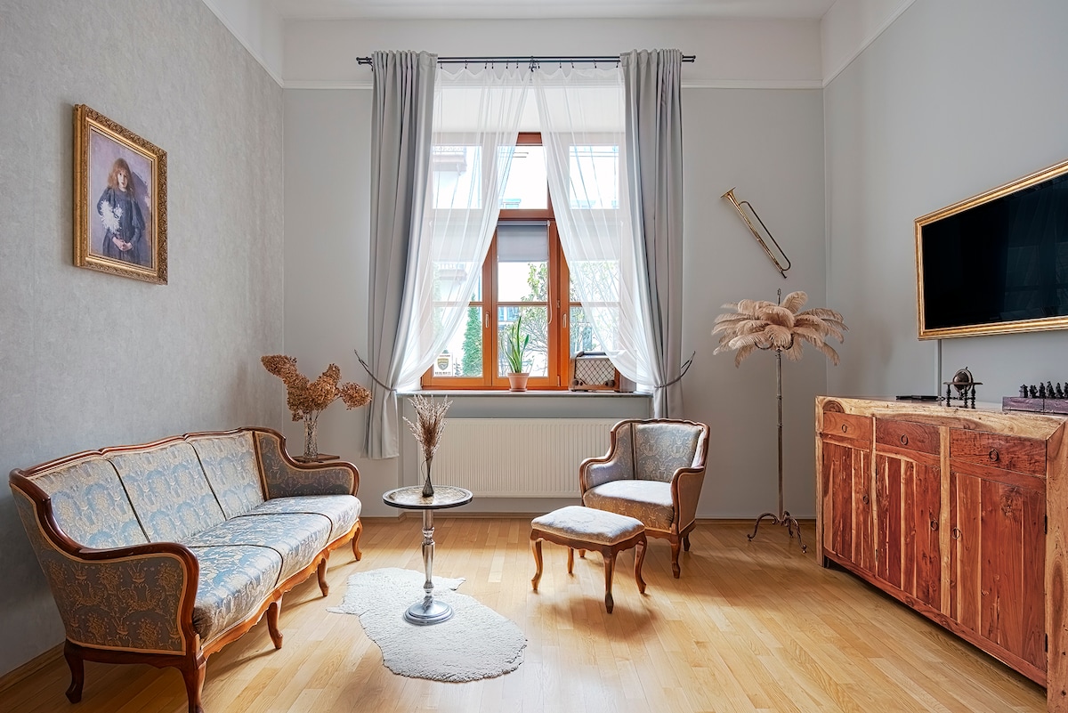 在明亮的起居區,配有羊皮地毯和復古家具,在古董卡布里歐沙發上放鬆身心。升級的裝飾和極簡的風格為這個重新設計的空間帶來了不拘一格的氛圍。 公寓位於19世紀的公寓房屋,位於主廣場和舊猶太區之間的舊城區。漫步在獨特的街道上,街道上有古怪的古董店、有趣的藝術畫廊和破舊的咖啡廳。