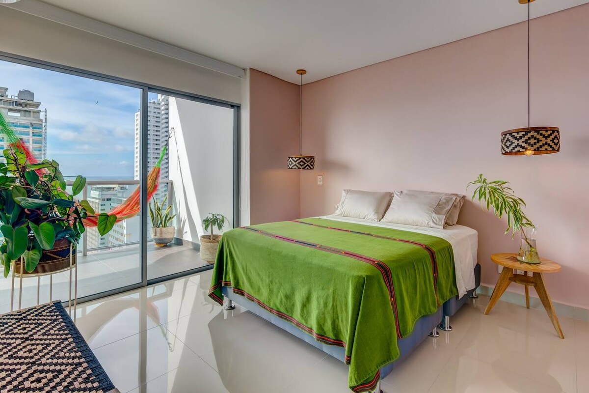 The apartment is tastefully decorated with a Colombian touch, vibrant and fresh. It features a lovely balcony where you can enjoy sea views and sunsets. It is fully equipped for both short and long stays, with 1 bedroom and 2 bathrooms, making it perfect for couples. The social area includes an outdoor pool, jacuzzi, and gym. The apartment is new, modern, and just steps away from the beaches of Bocagrande and Castillogrande, and only 10 minutes from the historic center.