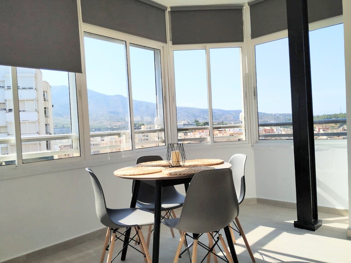 華麗的浪漫單間公寓,優雅且功能齊全,配備您放鬆愉快度假可能需要的一切。 翻新的單間公寓,位於托雷莫利諾斯市中心,位於安靜的街道上。非常適合情侶。陽光明媚、現代設計、非常乾淨舒適。單間公寓,配有雙人床(150 公分)和沙發床(140 公分)、浴室、小廚房、洗衣機、衣櫃、電視、WiFi。3 樓,可欣賞海景。步行即可抵達公共交通工具。