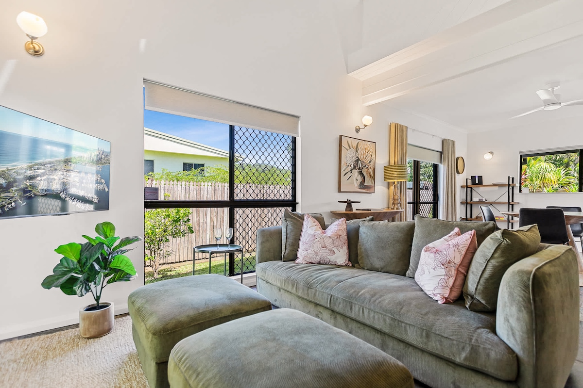 Cool off in the shared pool before wandering to the Esplanade, where beachfront cafés and restaurants overlook the soft sands of Palm Cove Beach. Back at home, bask in warm tropical days and breezy coastal nights at this modern townhouse, crafted for connection and comfort. Multiple living zones and split-system air conditioning ensure a relaxing stay, while the sleek kitchen flows to a private alfresco area with a BBQ, sun loungers and a lush lawn—ideal for unwinding after your adventures.