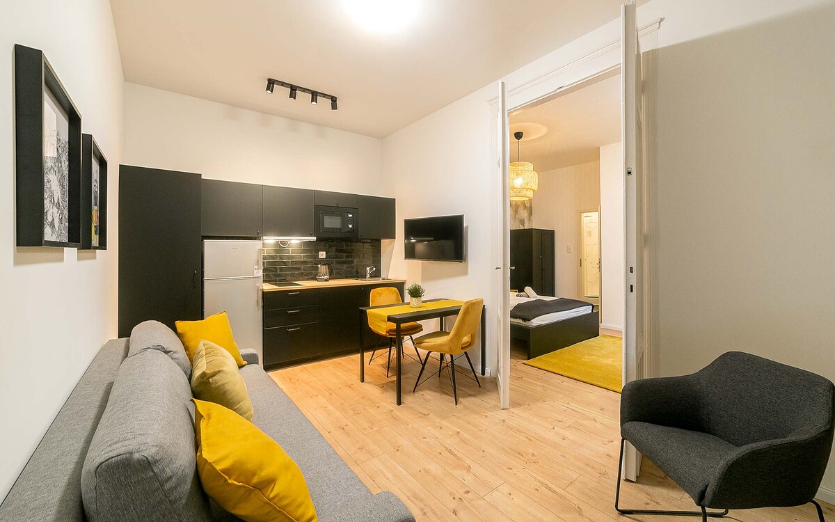 Élvezd a tágas, 40 nm-es Superior apartmanunk kényelmét Budapest szívében! A lakás modern, teljesen felszerelt konyhával, légkondicionálóval és stílusos fürdőszobával vár. A nagy belmagasság és a hatalmas ablakok miatt a tér különösen világos és otthonos. Minden fontos látnivaló sétatávolságra van, reggelente pedig bőséges reggelivel indíthatod a napot a házon belüli étteremben. Ideális választás, ha a belvárosi nyüzsgés mellett fontos számodra a minőségi pihenés is.