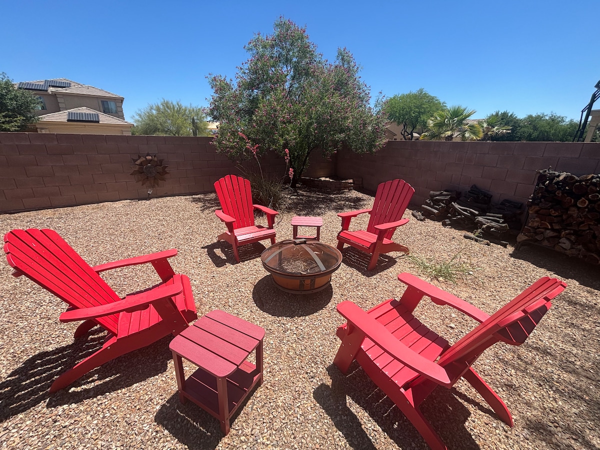 寬敞舒適的房源,光線充足,個性十足。溫水泳池和水療中心(額外)讓您享受如家一般的舒適。主套房配有按摩浴缸、露台和客廳的日式床墊。用餐選擇包括在戶外欣賞卡塔利娜山脈的日出。在大螢幕智慧電視前冒險後放鬆身心,享受提供的遊戲、影片或書籍,深夜遊泳,或坐在火坑旁,遠離城市燈光,欣賞星星。禁止未經授權的派對。不是派對租賃!