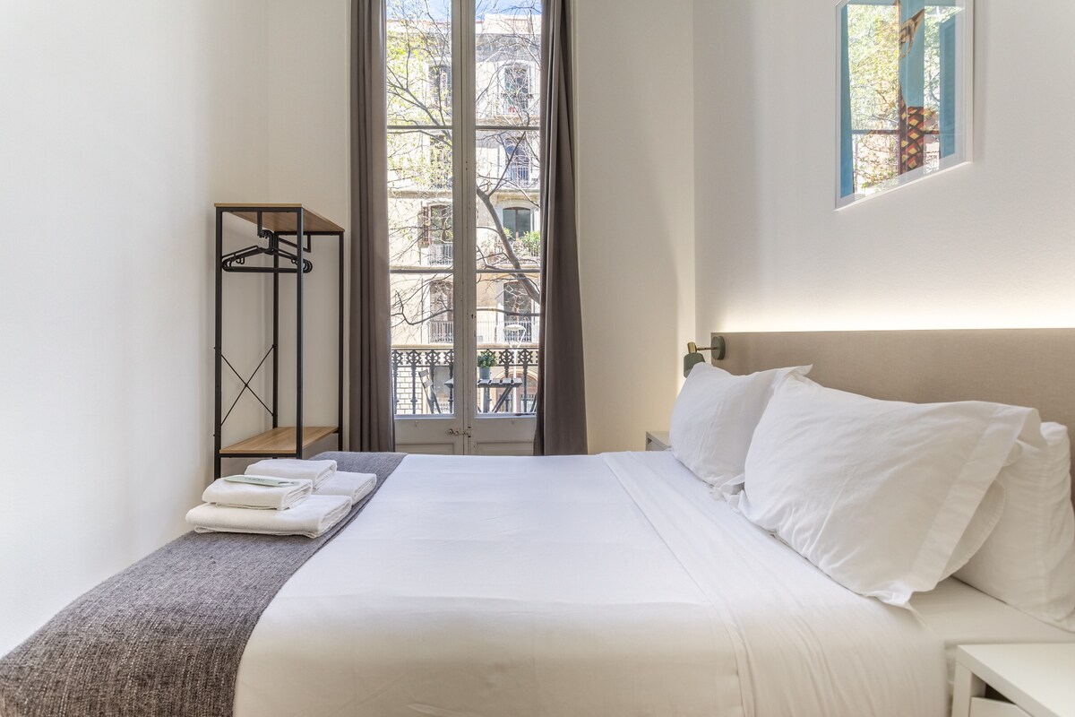 Casa Lolita Guesthouse的明亮房間,配有陽臺,位於l 'Eixample街區的最佳區域。 距離格拉西亞大道( Passeig de Gràcia )僅500米,距離加泰羅尼亞廣場( Plaza Cataluña ) 900米。 它與另外兩間房間共用浴室、可觀看Netflix的智慧電視、空調和暖氣、光纖網路、辦公桌和更多設施。 它有一個小陽臺,可俯瞰Calle Bruc。 您也可以使用旅舍公共區域:廚房和大露臺。