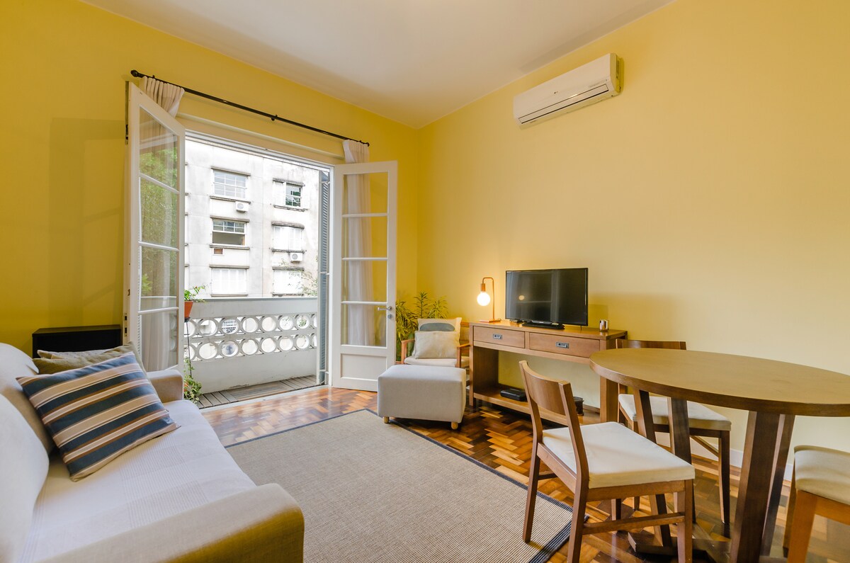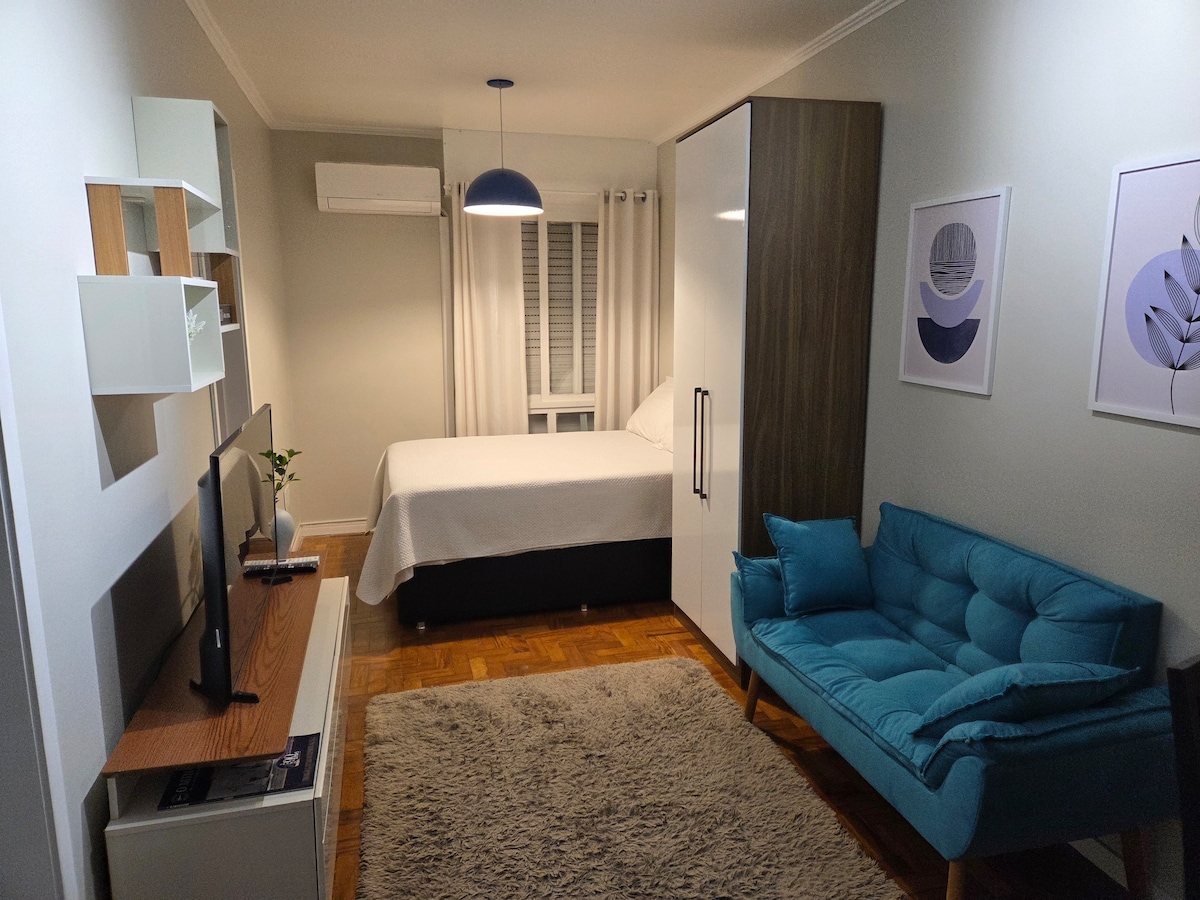 一間新翻修和裝飾的單間公寓,配備全新設備,位於阿雷格里港市中心,等待您的到來。一個特殊而溫馨的地方,滿足商務和/或旅遊、休閒、健康旅客的各種需求。私人空間包括浴室和單間公寓,配有超級舒適的 Tok & Stok 沙發床、家電、智慧電視和空調。位於共用公共區域的建築物中,共享共同生活的概念,具有極高的標準。