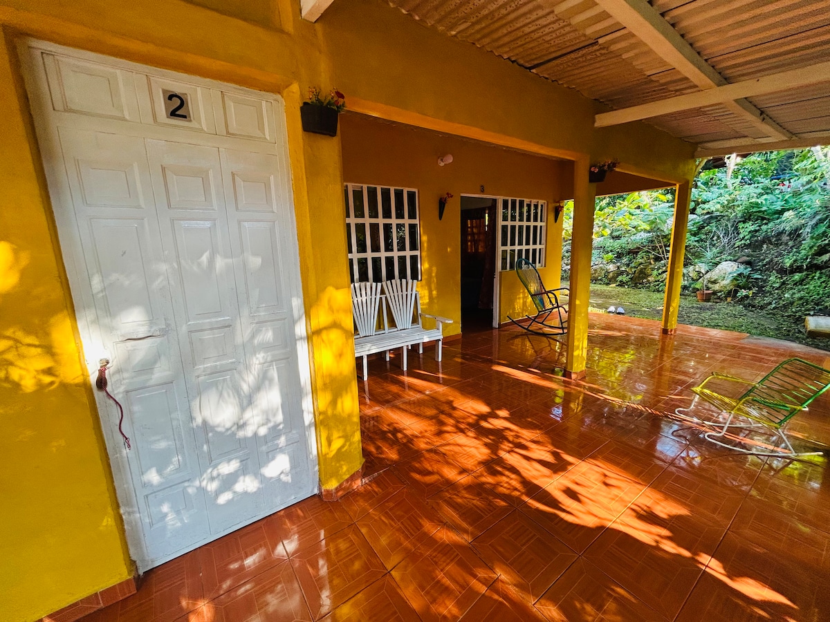 Cabaña de madera de dos pisos, terraza superior. Dos camas dobles. Baño seco interior. Rodeada de vegetación y aves. Un lugar ideal para descansar con el arrullo del agua y la selva, pasear entre árboles centenarios y palmas, observar pájaros y otros animales, conocer el uso de plantas medicinales, ponerse mascarillas de barro, bañarse en la poza del río o bajo la cercana cascada, junto a la que brotan excelentes aguas carbónica y sulfurosa.