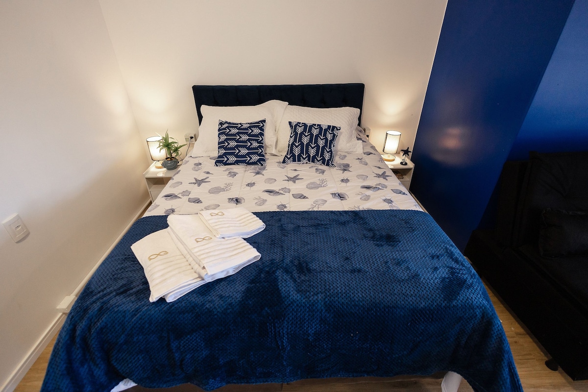 在這個地理位置優越的空間享受獨特的體驗。 Lava e Seca -牀上用品和浴巾 -帶按摩器的枕頭牀墊 -電烤箱 -微波爐 -淨水器 - Wi-Fi 400mb - 55英寸智能電視,配備FireTV -吟唱工作 -沙發牀 Caxias do Sul的最佳位置,就在Pátio da Estação前面。 靠近Caxiense夜生活、夜總會、酒吧、餐廳、大學、波旁購物中心和生態博覽會。 車房。 大樓有攝像頭監控。