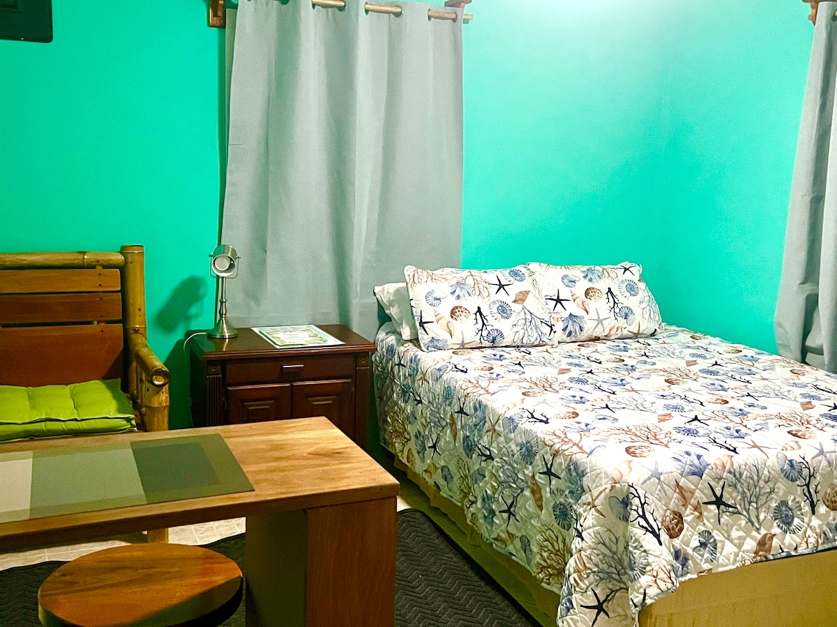 位於我們房源下層的兩間單間公寓之一。寬敞且涼爽,位於Caye Caulker住宅區的樹木繁茂的房源。 每個單位都有全套廚房、冷氣、風扇、吊床、WiFi、雙人床、日式床墊、無限飲用水和自行車! 與我們和其他房客共用的庭院內的烤肉架和野餐桌。我們的房源有五個出租房。 我們與兩個女兒、兩隻狗和兩隻貓住在一起。