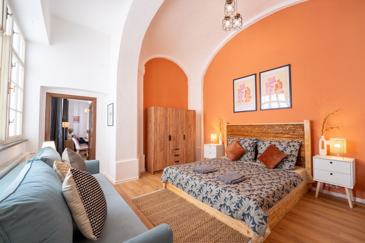 公寓是一間設計師現代公寓,位於布拉格一棟美麗的建築內,位於布拉格市中心-布拉格舊城區-城市最歷史的部分,位於一條美麗的通道內,充滿餐廳和商店,但非常安靜 這棟建築的歷史可以追溯到12世紀,但最近已經翻修。 公寓配有1張特大雙人床、1 張沙發床、設備齊全的廚房、空調、智慧電視、高速網路
