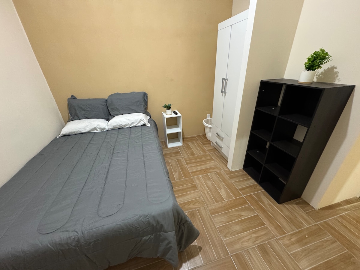 Disfruta de este Loft práctico y cómodo a 10 minutos del Aeropuerto de la Ciudad de México, Estadio GNP/Autódromo, Palacio de los deportes, Terminal de Autobuses TAPO Centro Comercial Oceanía/IkEA con cafés, bares, restaurantes, cines y tiendas. El Loft se está ubicado en segundo nivel, con cama individual, Cocina equipada, TV ROKU , escritorio, caja de seguridad Wi-Fi y baño privado. El edificio cuenta con Lavadora y Roof Garden de uso compartido. Frente al edificio hay un parque.