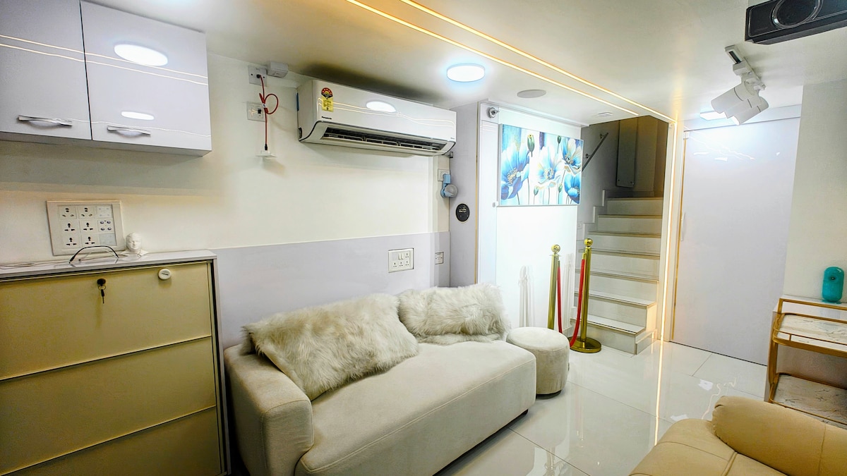 在熙熙攘攘的人群中佔有一席之地。非常適合旅行中的音樂家、有風格的旅客或只是在城市中尋找價格實惠但獨特的短期住宿的人。3 BHK擁有獨家工作室,可滿足新時代內容創作者的所有需求、辦公空間、1張主床、1張可擴展床和L型沙發床和廚房。所有房間均有空調和智慧照明。客廳配有55吋電視、7.2 AV和10英尺投影螢幕。