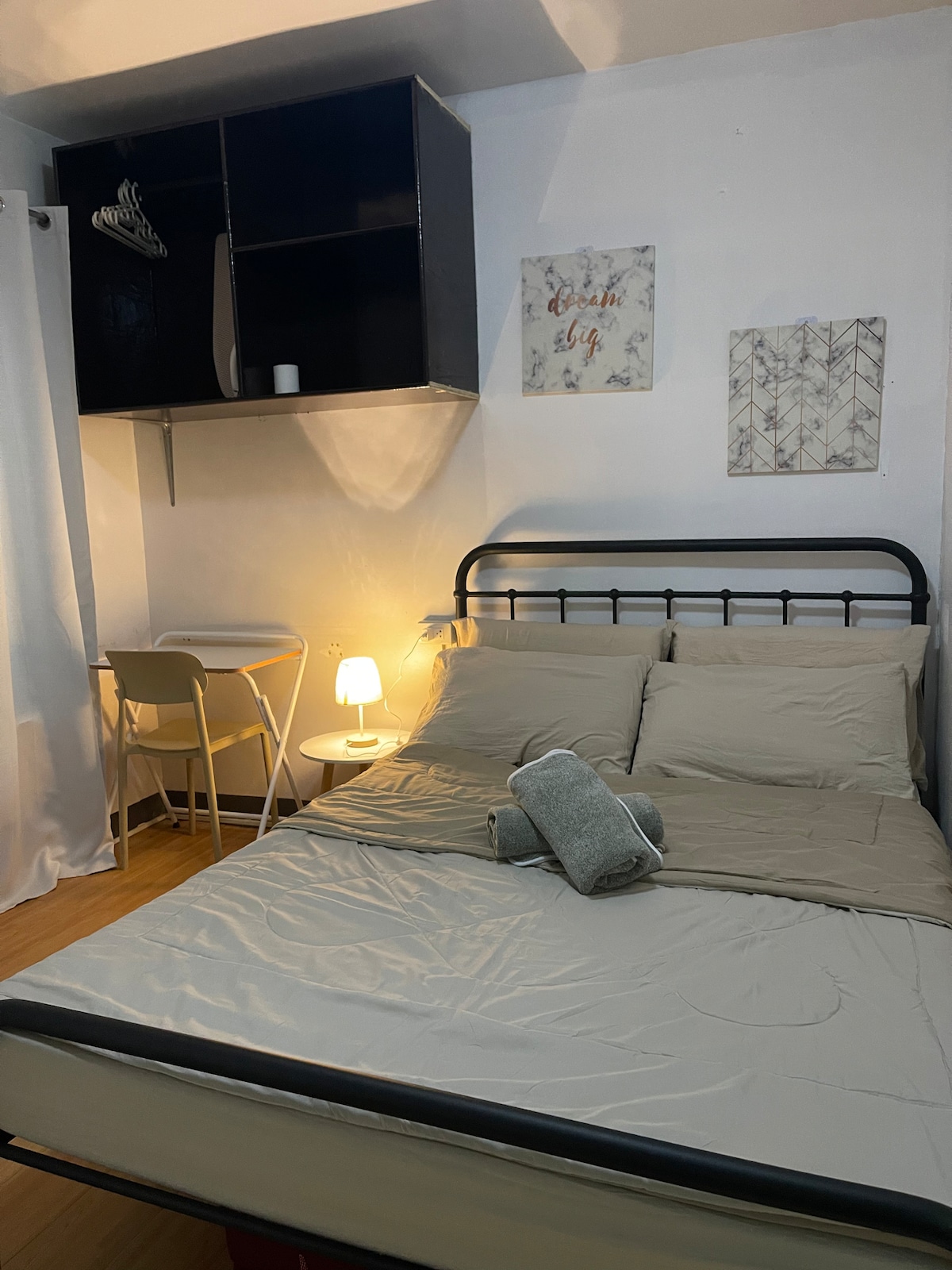 Comfy, accessible, and aesthetic condo studio unit near Mactan Cebu International Airport 24 sqm condo unit with balcony Oceanview with Queen-sized bed • can fit 4-6 pax • extra foam mattress and extra blanket provided • free pool access for 2, paid parking inside Bathroom with: • shower, heater, bidet • shampoo | conditioner | body gel provided • towels Entertainment • 200 mbps internet connection • 1080p 4K Smart Projector with surround sound • Mini karaoke • Card and board games